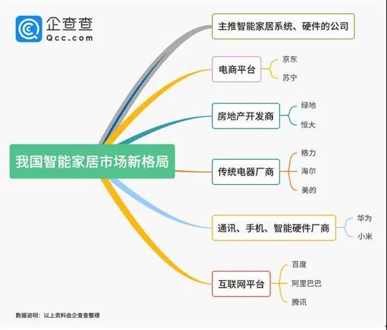 不過,目前中國智能家居市場正在形成新的格局,企查查整理了部分涉足智能家居的品牌,大致分布在這六大陣營:主推智能家居概念的智能家居系統(tǒng)和智能家居硬件初創(chuàng)公司陣營;以格力、海爾、美的等為代表的傳統(tǒng)電器廠商陣營;以華為、小米等為代表的通訊、手機(jī)、智能硬件廠商陣營;以BAT為代表的互聯(lián)網(wǎng)平臺陣營;以京東、蘇寧等為代表的電商平臺;以綠地、恒大為代表的房地產(chǎn)開發(fā)商。