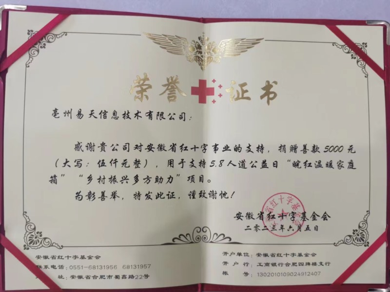 今年的5月8日是第76個世界紅十字日,中國紅十字會總會與騰訊公益聯(lián)合發(fā)起第二屆“5·8人道公益日”網絡眾籌活動。亳州易天科技通過亳州紅十字工作人員了解到活動后積極參與公益事業(yè)。捐款5000元,用于支持以支持5.8人道公益日“皖紅溫暖家庭箱”和“鄉(xiāng)村振興多方助力”。所籌善款將用于向全省困難群眾發(fā)放慰問物資。